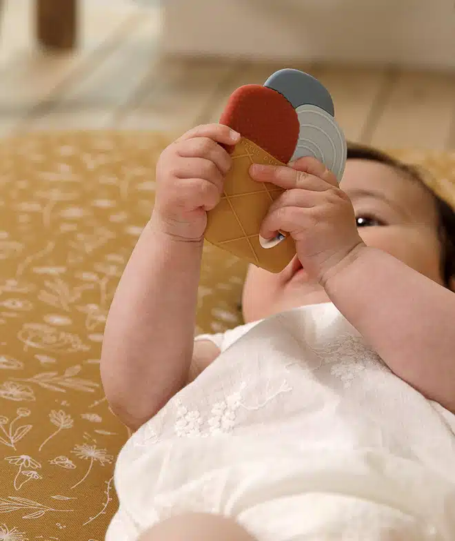 Ensuite, nous avons fait une sélection bébé avec un cube d’activités pour stimuler les sens de votre bébé avec les différents bruits et matières. Il y a également un anneau de dentition avec un design de glace pour soulager les petites dents de bébé!
