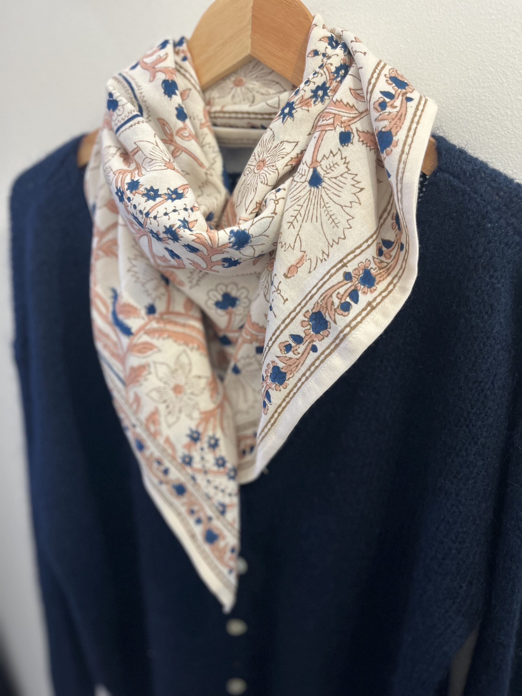L’accessoire intemporel à adopter ♡ Nos foulards adultes (100×100 cm) sont pensés pour sublimer toutes vos tenues, été comme hiver. Léger, élégant et pratique, il se porte aussi bien autour du cou, en ceinture ou même dans les cheveux. Imprimés à la main à Jaipur avec la technique traditionnelle du block print, chaque foulard se distingue par ses nuances uniques obtenues grâce à des pigments naturels. De petites irrégularités peuvent apparaître, signe de leur fabrication artisanale et de leur authenticité. Détails : Dimensions : 100 x 100 cm Finitions délicates avec surpiqûres ton sur ton Entretien : lavage en machine programme délicat / pas de sèche linge Un accessoire fabriqué dans un atelier familial en Inde, pensé pour durer et vous accompagner au quotidien.