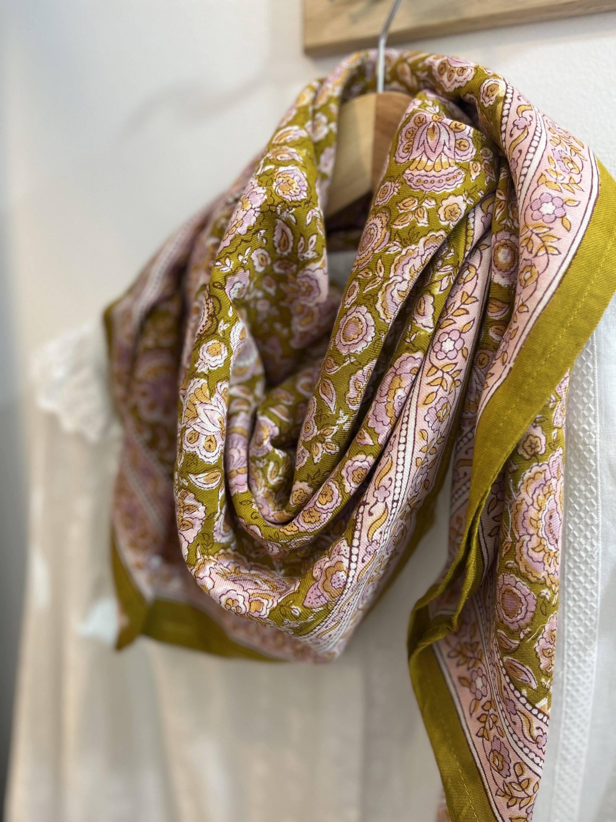 Avec ses tons khaki intemporels, ce grand foulard imprimé à la main incarne un esprit bohème naturel. Un accessoire facile à associer, parfait pour structurer une tenue tout au long de l’année.