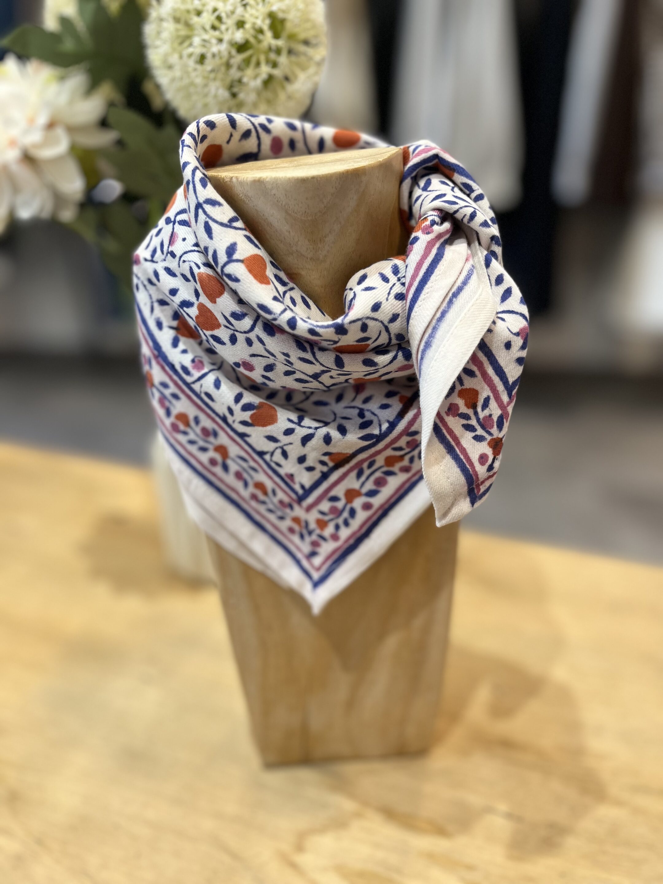 Foulards Bébé, Enfant et Adulte Venez découvrir nos foulards pour toute la famille! Il est confectionné artisanalement grâce à la technique indienne du block-print, les couleurs sont réalisées à partir de pigments naturels. Cette confection manuelle peut entraîner certaines irrégularités qui en font le charme et le rendent unique ♡ Chaque collection de foulards est unique, il est impossible d’obtenir les mêmes couleurs d’une série à une autre. – Dimensions: 50 x 50 cm- Tissu: 100% coton – Finition avec surpiqûres ton sur ton – Lavage doux en machine à 30°C seuls ou avec des coloris similaires.- Pas de sèche-linge. Fabriqué à Jaipur en Inde dans un atelier familial.